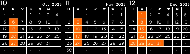 「TRATTORIA SOAVE」の2025年10月〜12月の店休日はカレンダーをご覧ください。 ※■印の付いている日が店休日になります。