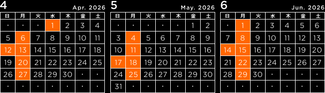 「TRATTORIA SOAVE」の2026年4月〜6月の店休日はカレンダーをご覧ください。 ※■印の付いている日が店休日になります。